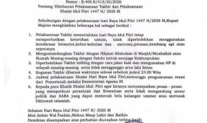 GARUDAPOS.ID|MAJENE,– Bupati Majene menerbitkan surat imbauan terkait pelaksanaan takbiran dan Salat Idulfitri 1447 Hijriah/2026 M. Surat bernomor B.400.8/413/III/2026 itu dikeluarkan