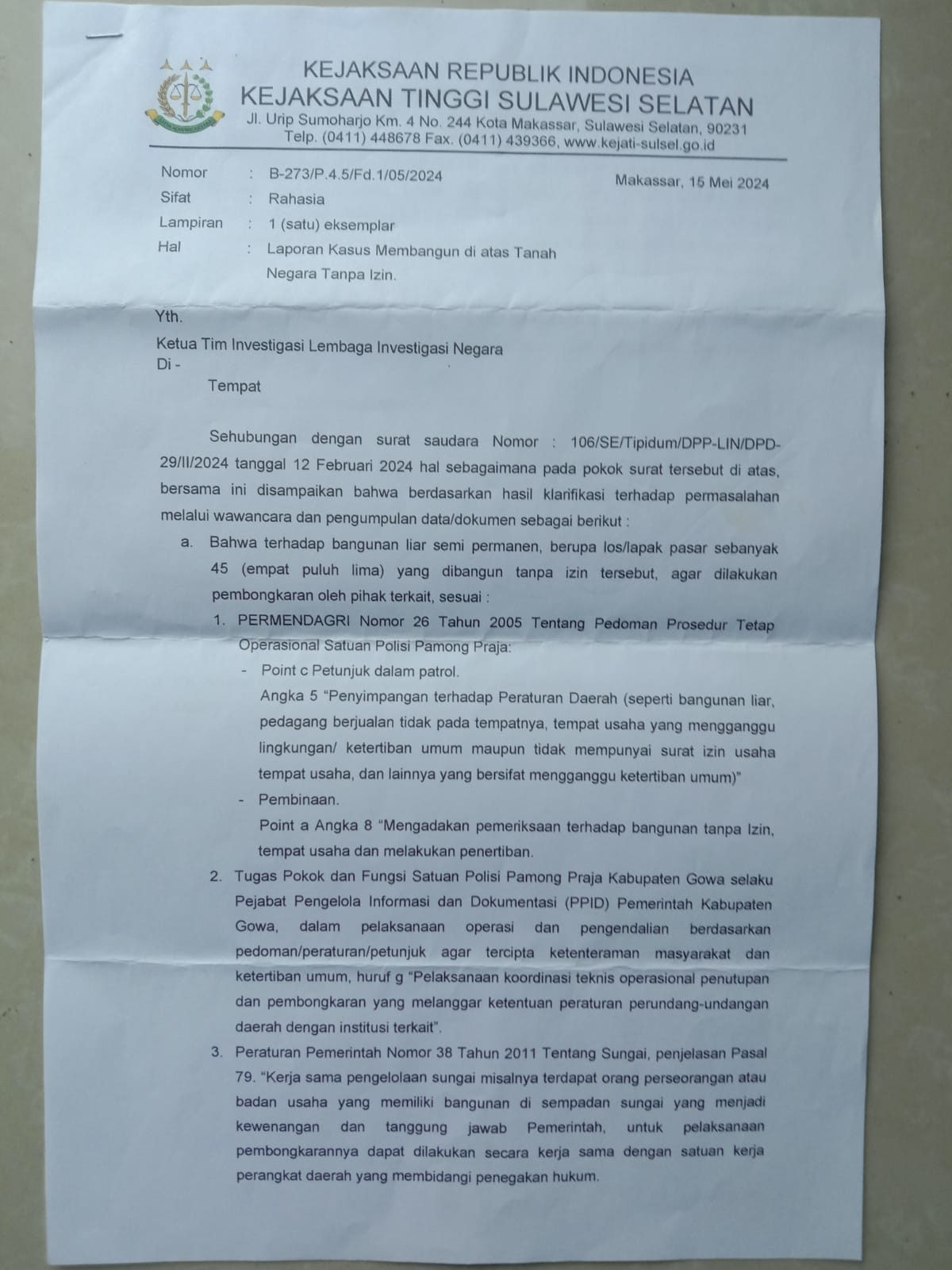 Menurut A Nasrun Dg Tarank, “Kami sudah melaporkan pembangunan pasar ilegal yang ada di Sungguminasa kabupaten Gowa ke Kejati Sulsel dan hasilnya turun putusan bahwa pasar ilegal tersebut harus dibongkar, kami juga sudah laporkan ke bupati gowa dengan nomor registrasi A.144.2408.38.405.18077 dan Nomor Agenda AG.A.144.24-08.51.442.0539 tapi hingga saat ini bapak bupati sama sekali belum mengambil tindakan” ,tuturnya.