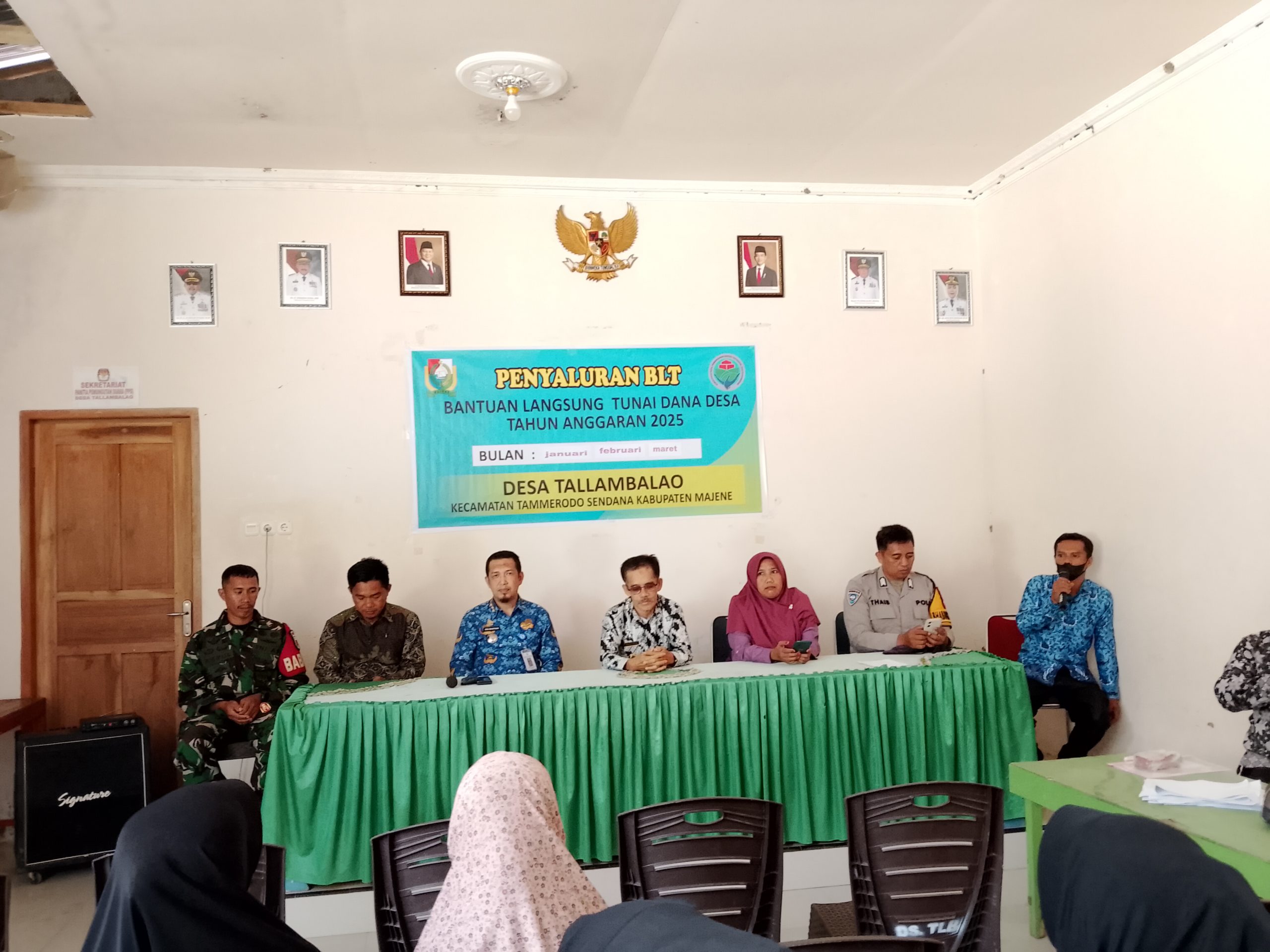 Sementara Sambutan Camat Tammerodo Sendana, Edi Bastian, S.E.: “Puji syukur atas nikmat yang diberikan Allah SWT. Saya mengapresiasi Pemerintah Desa Tallambalao atas penyaluran BLT ini. Semoga bantuan ini dapat bermanfaat bagi masyarakat dan mendorong mereka untuk tetap sehat dan produktif. Bantuan ini diharapkan dapat digunakan secara bijak dan tepat sasaran untuk memenuhi kebutuhan pokok, bukan untuk hal-hal yang tidak penting. Saya juga ingin menyampaikan permohonan maaf karena tidak selalu dapat hadir di setiap acara penting di desa ini.”