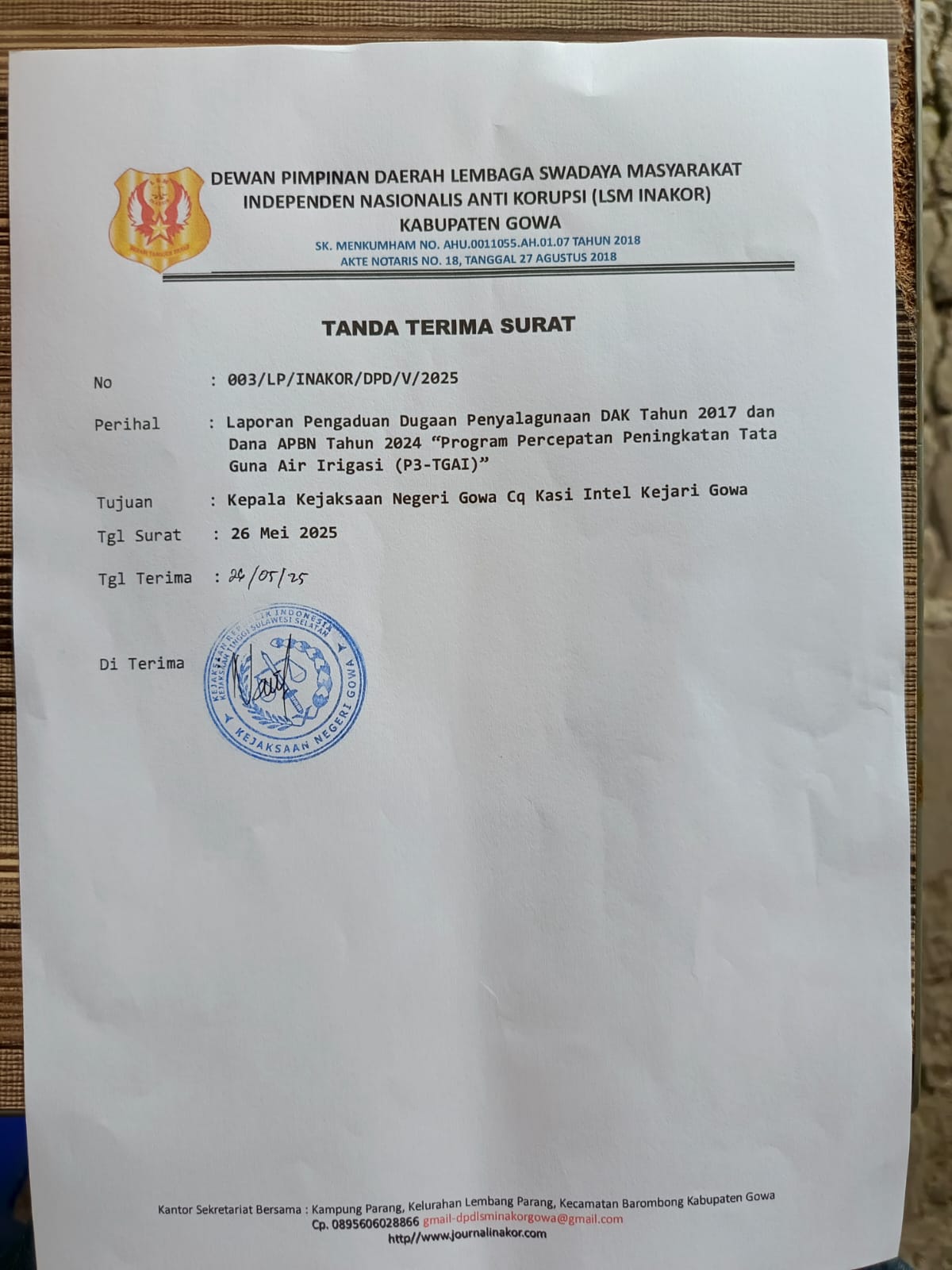 Gowa,Garudapos.id — Lembaga Swadaya Masyarakat Independen Nasional Anti Korupsi (LSM INAKOR) Gowa resmi melaporkan 2 proyek yang menggunakan APBD Gowa dan APBN 2024, Senin (26/05/2025).