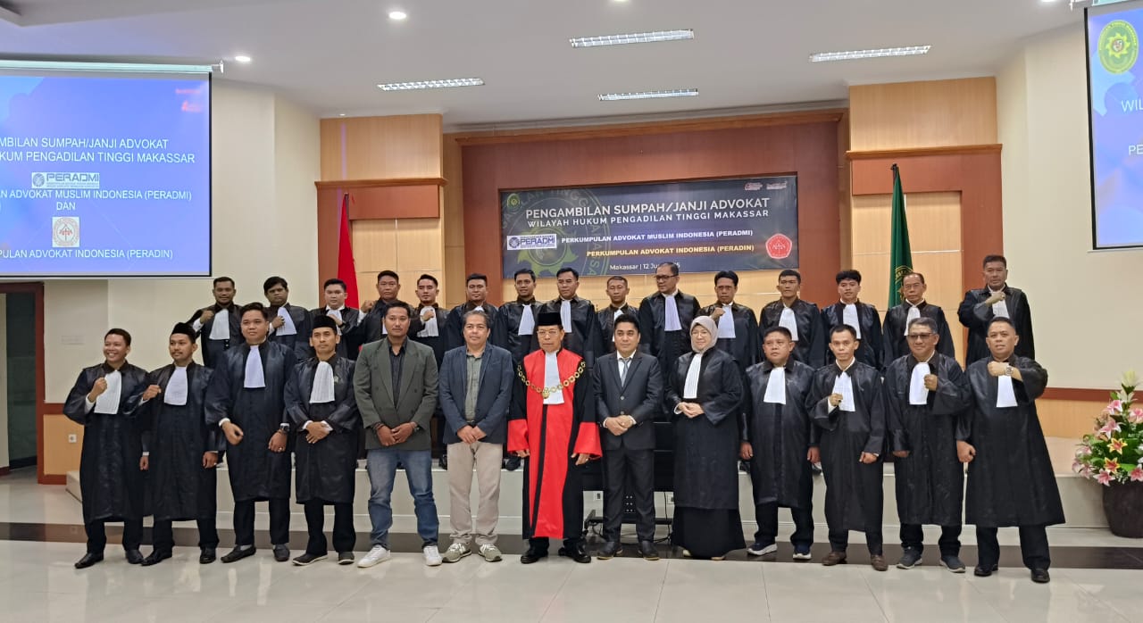 Sebanyak 24 Advokat dari OA PERADMI menjalani proses Pengambilan Sumpah Janji Advokat di Pengadilan Tinggi Makassar oleh Ketua Pengadilan Tinggi Makassar, Dr. H. Zainuddin, S.H., M.Hum pada Rabu,12 Juni 2025.