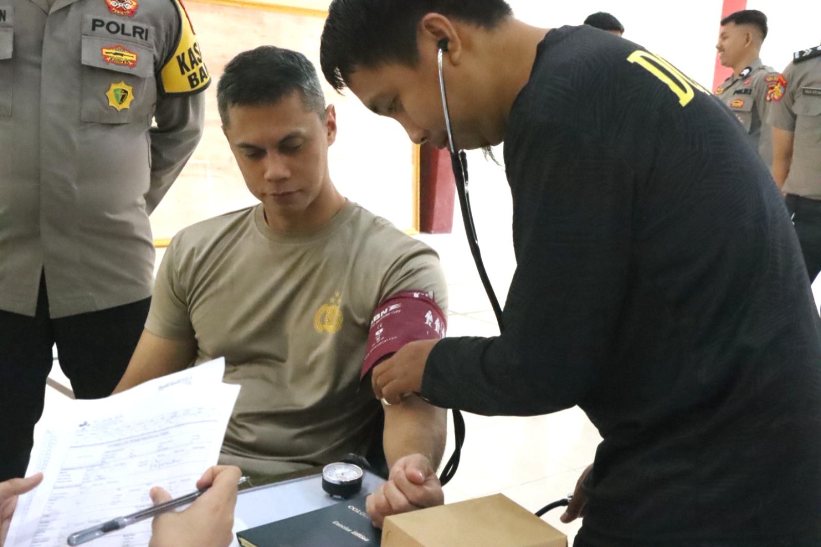 Adapun rangkaian pemeriksaan yang dilakukan oleh Tim Bid Dokkes Polda Sulbar meliputi pengukuran tekanan darah, pemeriksaan darah, elektrokardiogram (EKG) jantung, pemeriksaan urine, rontgen, serta pemeriksaan gigi. Pemeriksaan tersebut dilakukan secara menyeluruh dan profesional guna mendapatkan gambaran kondisi kesehatan masing-masing personel.