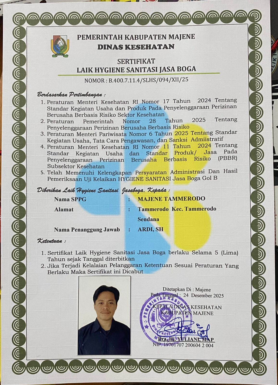Kepala SPPG Tammerodo Sendana, Ardi,S.H, menegaskan bahwa kepemilikan sertifikat ini merupakan bukti keseriusan pihaknya dalam menjaga standar kualitas pangan di wilayah Kecamatan Tammerodo Sendana.