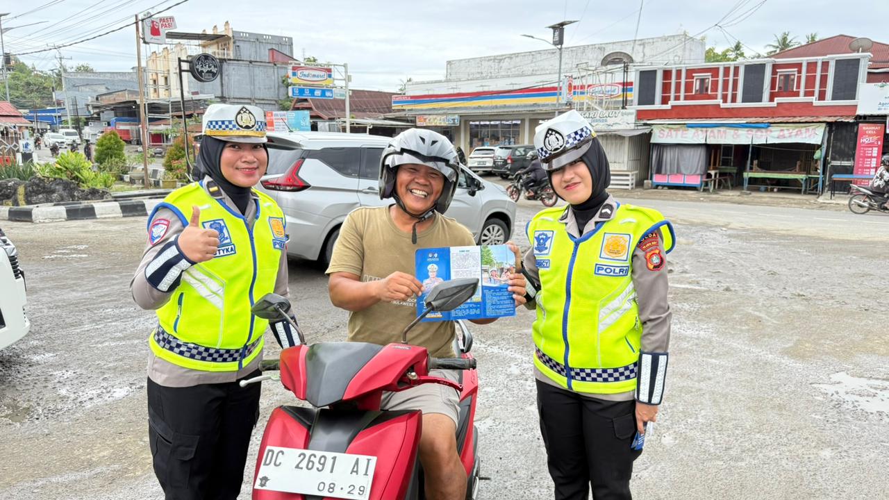 Selain memberikan leaflet, personel juga menyampaikan edukasi secara tatap muka kepada masyarakat pengguna jalan.