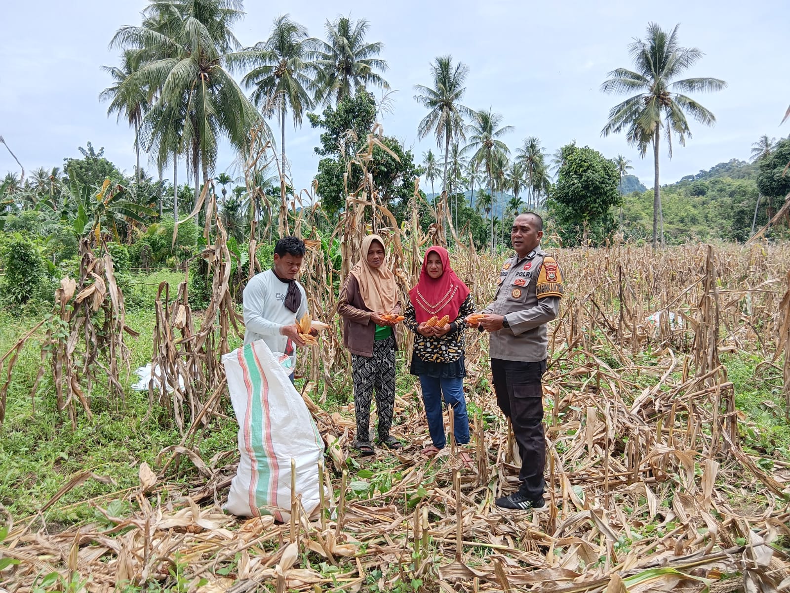Dukung Ketahanan Pangan, Bhabinkamtibmas Polsek Malunda Panen Jagung Bersama Warga Dusun Seppong