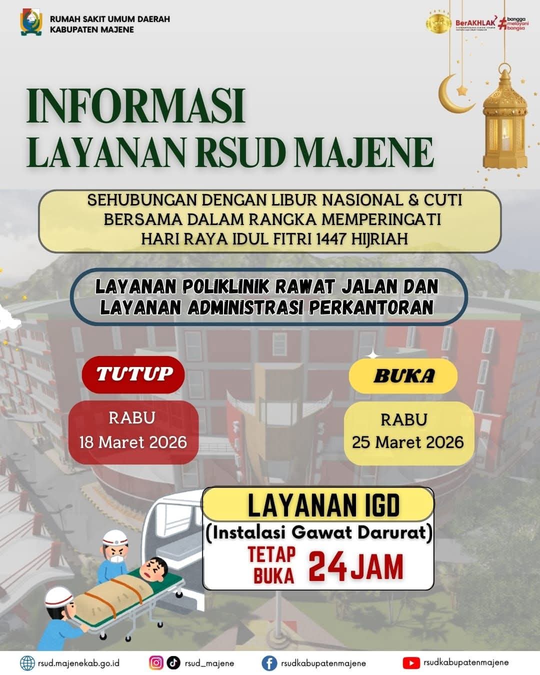 Majene, Garudapos.id – RSUD Kabupaten Majene mengumumkan penyesuaian jadwal layanan kesehatan dalam rangka libur nasional dan cuti bersama peringatan Hari Raya Idul Fitri 1447 Hijriah.