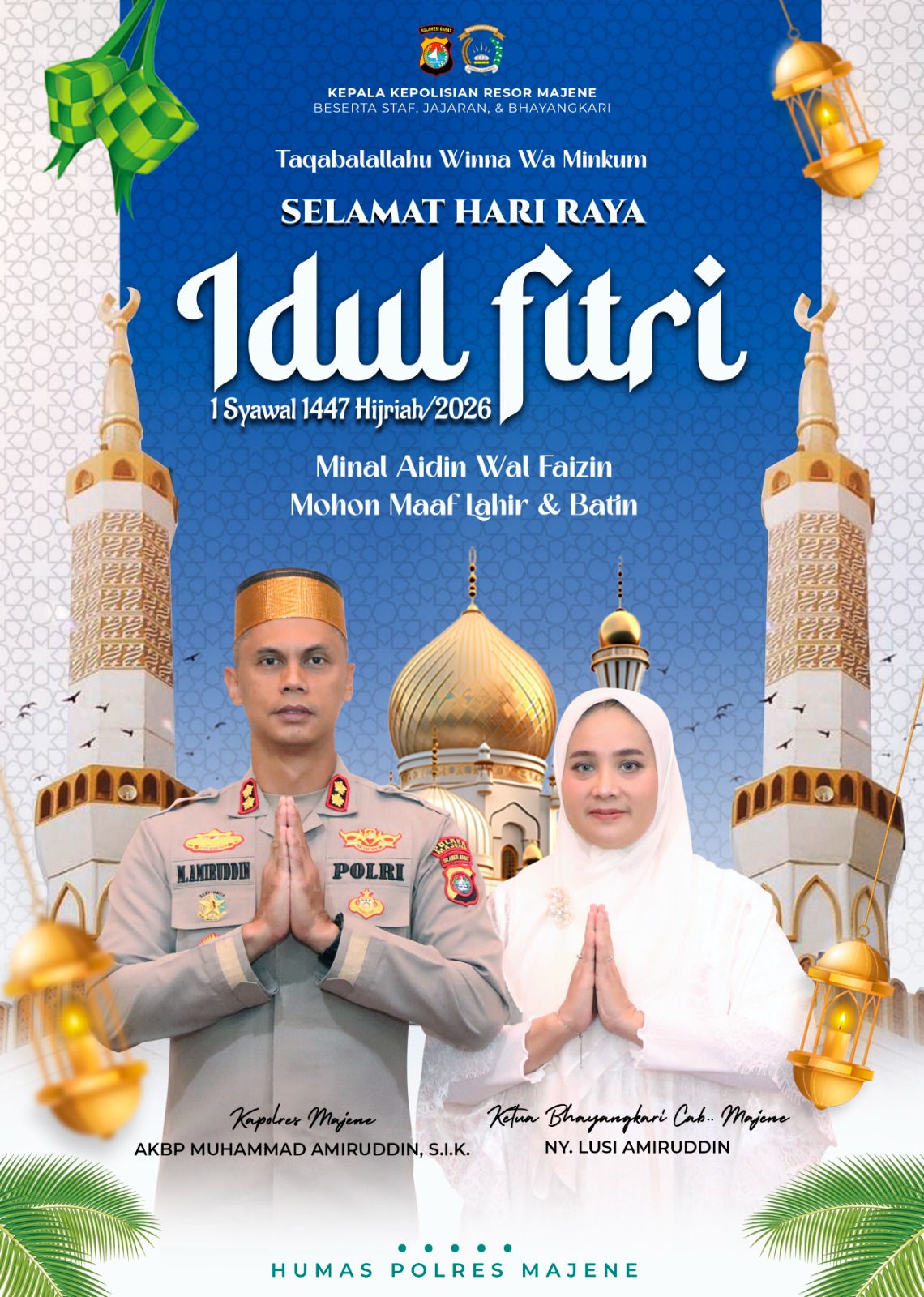 MAJENE, GARUDAPOS. ID – Kepolisian Resor (Polres) Majene melalui Kepala Polres AKBP Muhammad Amiruddin, S.I.K., beserta istri Ny. Lusi Amiruddin selaku Ketua Bhayangkari Cabang Majene, mengucapkan selamat Hari Raya Idul Fitri 1 Syawal 1447 Hijriah/2026 Masehi kepada seluruh masyarakat Majene dan umat Islam di seluruh Indonesia. Jum’at (20/3/26)