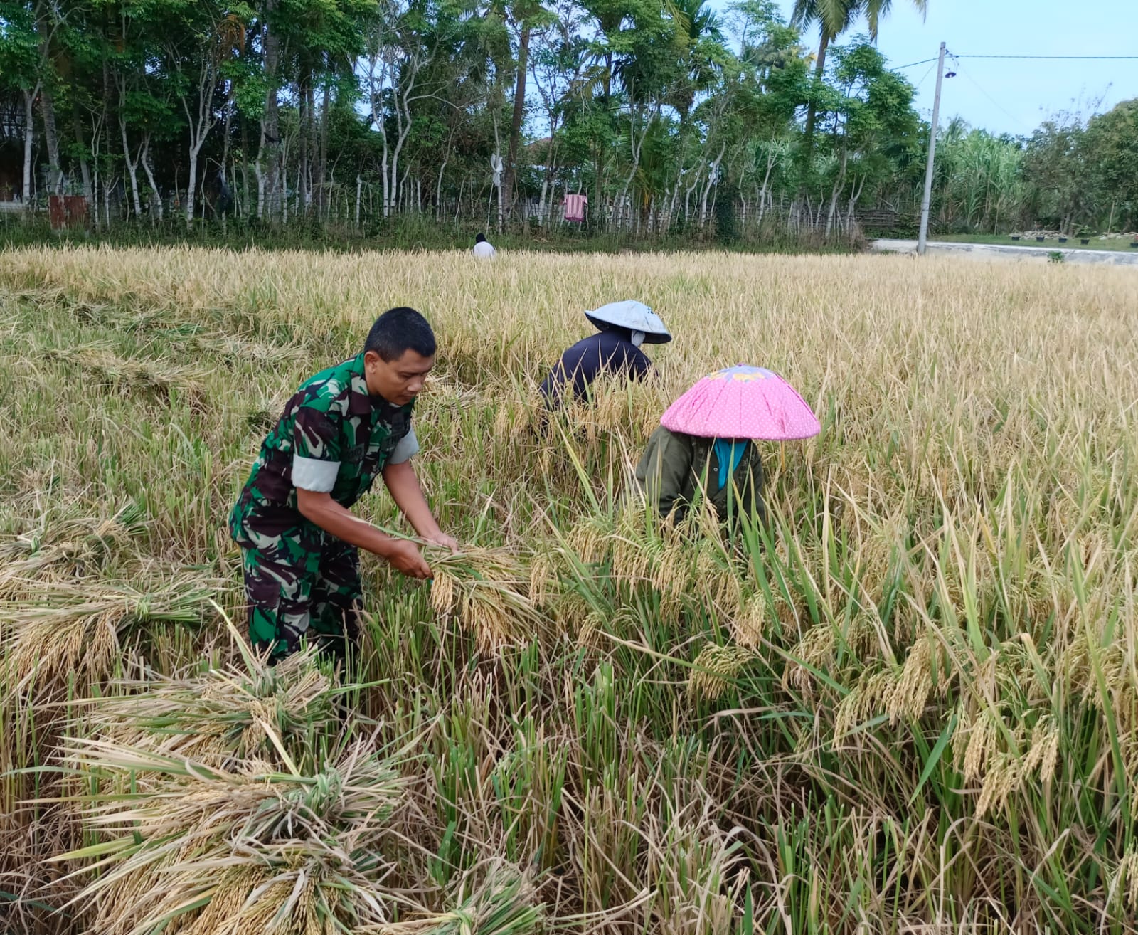 Hamparan sawah yang menguning menjadi saksi kebersamaan antara prajurit TNI dan petani. Dengan penuh semangat, Babinsa Serka Joko ikut memotong batang padi dan mengumpulkannya menjadi ikatan bersama warga, menciptakan suasana yang hangat dan penuh kekeluargaan.